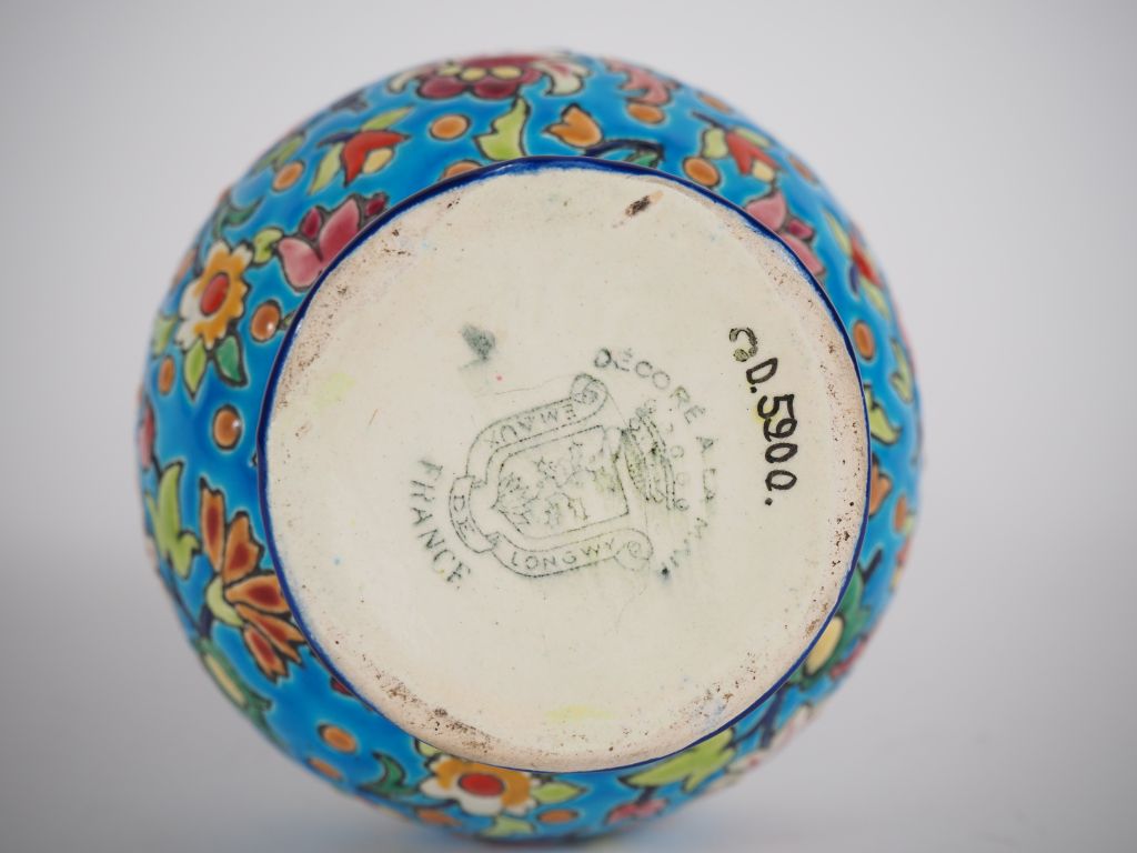 LONGWY. Vase en faïence à décor en émaux polychromes de fleurs. Signé. H. 21 cm.
