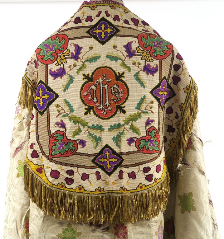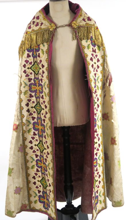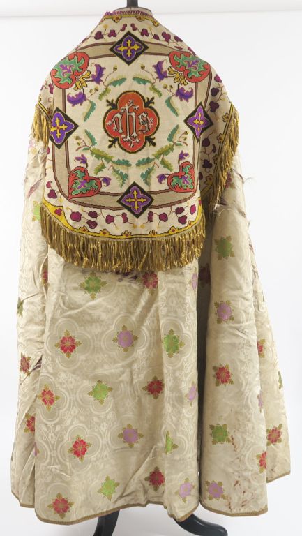 Lot comprenant une chape et un voile huméral XIXème -Xxème. Fond de la chape en étoffe façonnée crème, à décor brodé au point de croix de soies polychromes, soie fusée en plusieurs points . Voile huméral, en étoffe de soie façonnée, décor à la colombe, avec en son centre une colombe en guipure paillette or, filé or et argent . Etat d’usage. (quelques trous et usures) Expert : Véronique Dumont Castagné