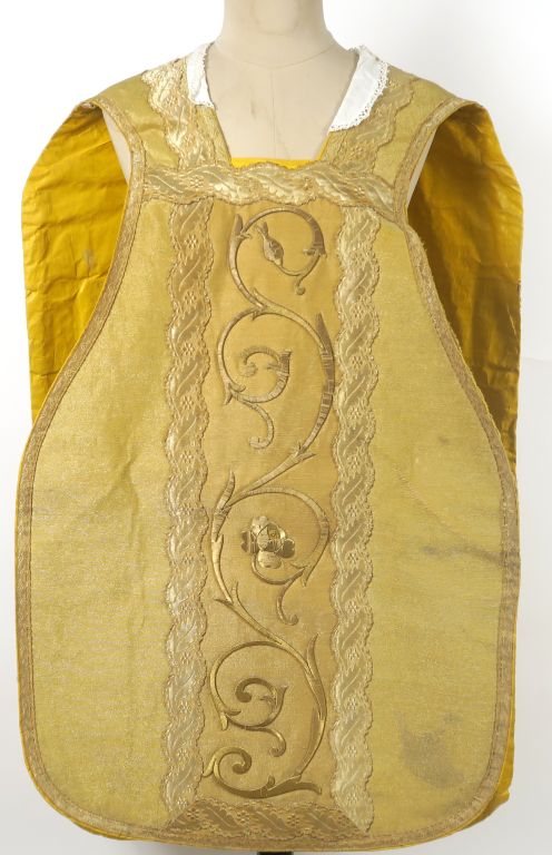 Lot comprenant une chasuble et son voile de calice fin XIXème - début XXème. Fond drap d’or. Orfroi avant aux arabesques florales en guipure filé or. Même décor pour l’orfroi du dos dans lequel s’inscrit un Agneau de Dieu pattes et tête argentées, corps brodé en bouillon. Doublure coton jaune. Belle pièce. (petite tache à l’avant) Expert : Véronique Dumont Castagné