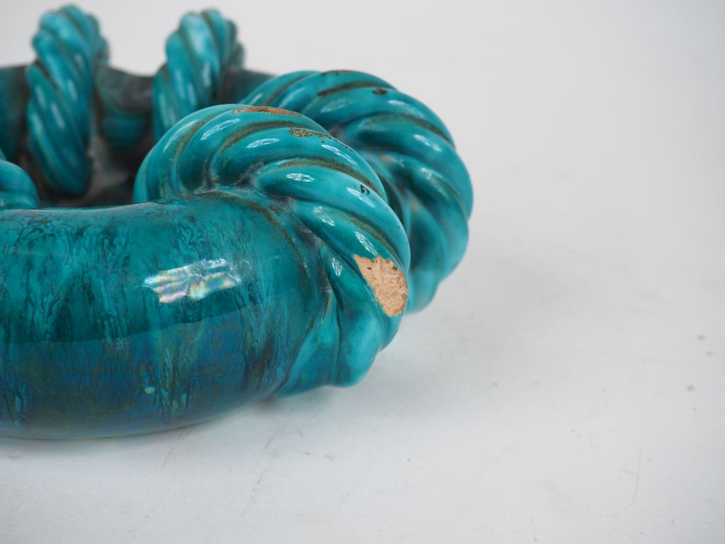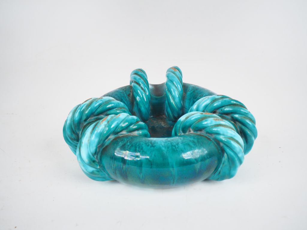 Louis GIRAUD à Vallauris. Cendrier en céramique verte à décor de cordages. Signé. Dim. 7,5 x 19 cm. (petits sauts d'émail).