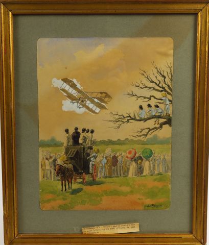 Lucien ROUSSELOT. Aquarelle, signée en bas à droite. '10 décembre, Saigon pour la première fois un avion pilote 'Van Den Born' sillonne le ciel de l'Indochine. 26,5 x 20,5 cm vente avec faculté de réunion