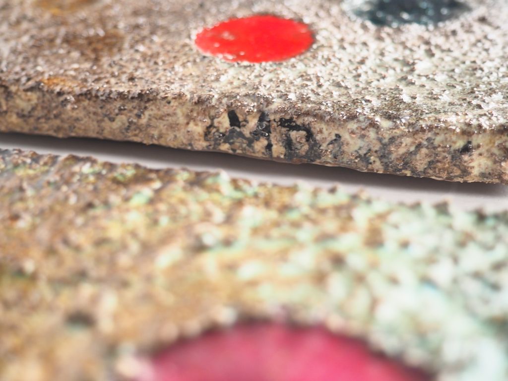 M. DUCOS. Deux différentes plaques en terre cuite émaillée polychrome, à décor de motifs géométriques. Signées Dim. 30 x 25 cm - 30 x 10 cm