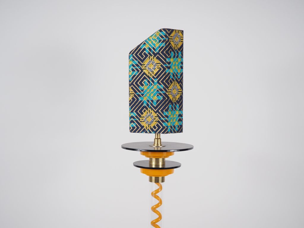 MEMPHIS (dans le goût de). Lampe en métal laqué, plastique et textile. H. 71 cm.