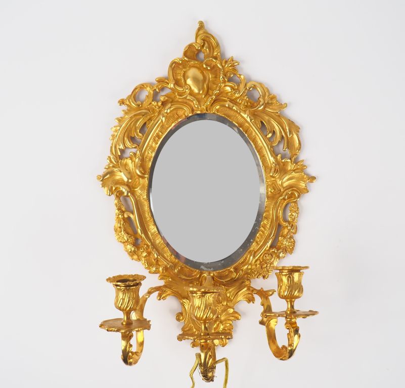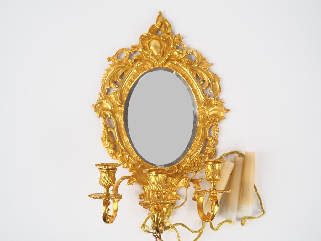 Miroir d'applique de style Louis XV en bronze doré à décor de rocailles, de visage de jeune fille et de rinceaux feuillagés, éclairant à 3 lumières. Dim. 40 x 27 cm.