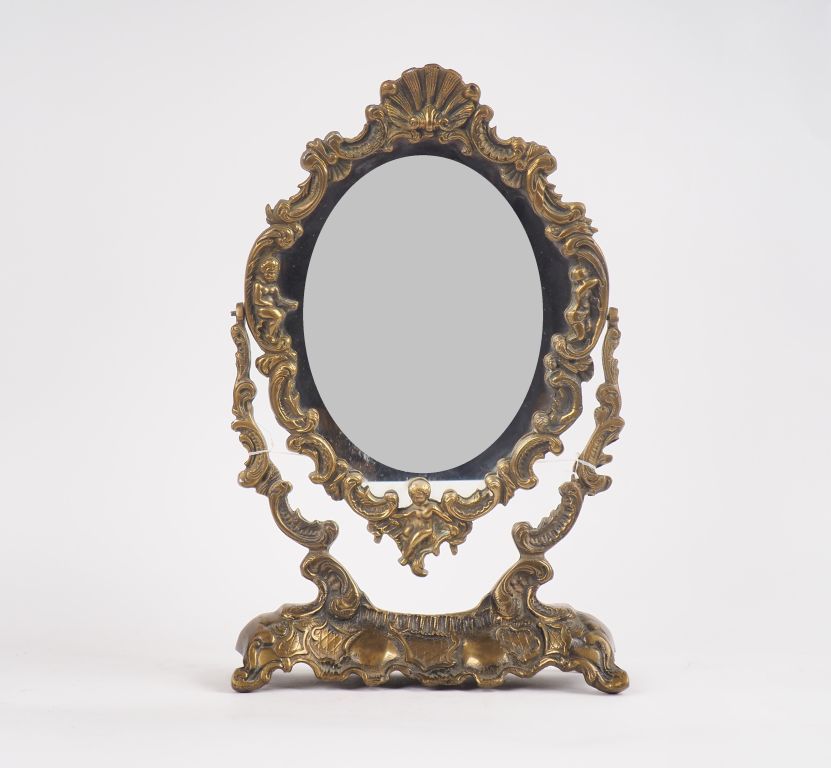 Miroir de toilette de style Louis XIV en bronze à décor de Putto et de rinceaux feuillagés. Dim. 47 x 30 x 11 cm.