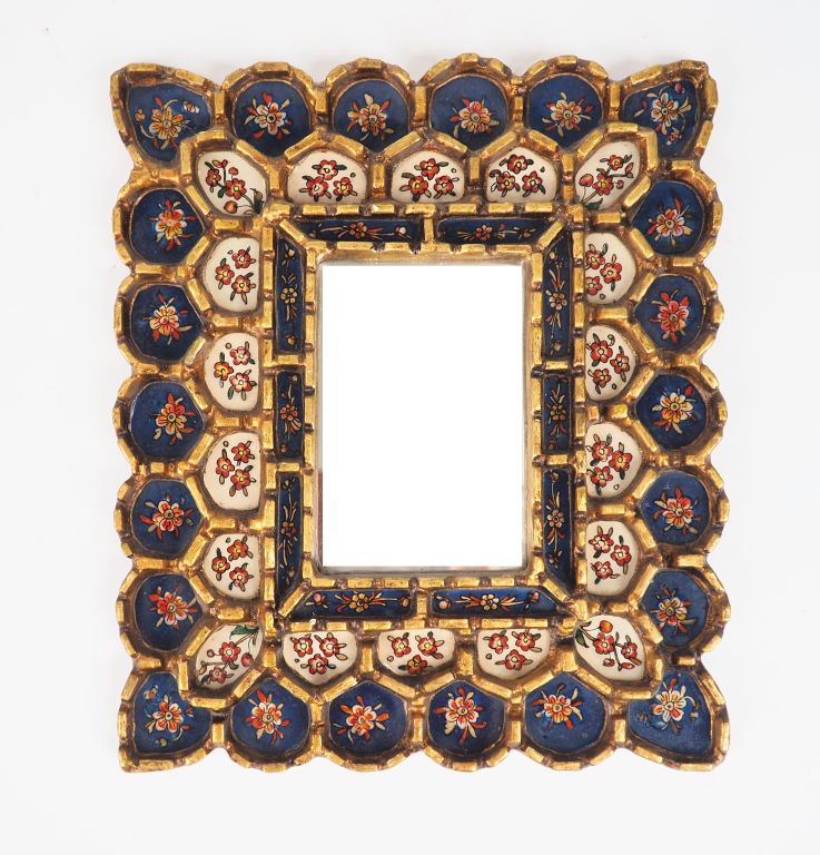 Miroir XXème en verre églomisé à décor polychrome de fleurs dans des réserves. Dim. 30 x 25,5 cm.