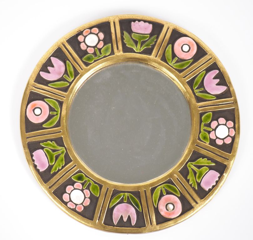 Mithe ESPELT. Miroir circulaire en céramique polychrome à décor de fleurs dans des réserves. Diam. 29 cm.
