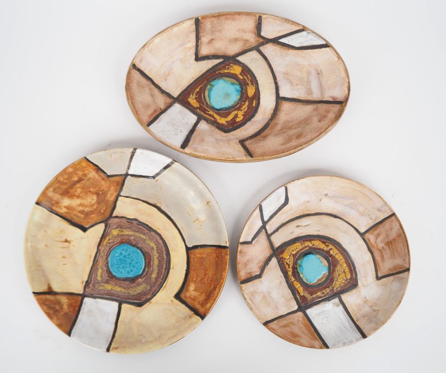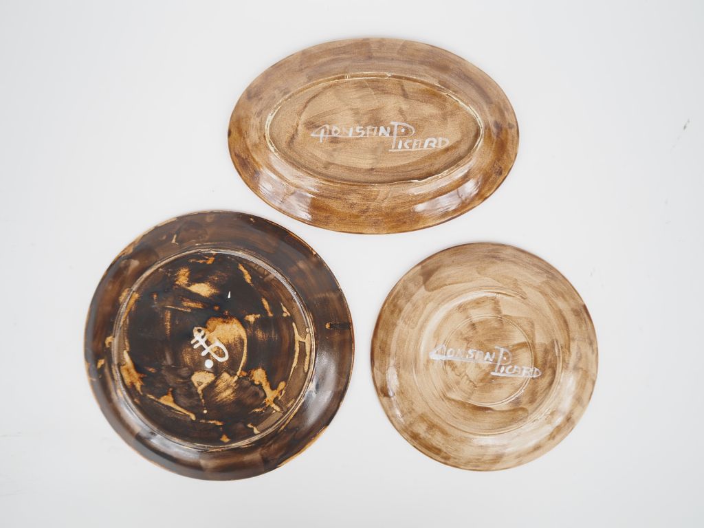 MONSAND PICARD. Partie de service de table années 70 en céramique polychrome : 10 assiettes plates 10 assiettes creuses 9 assiettes à dessert 1 ramequin. Signée.