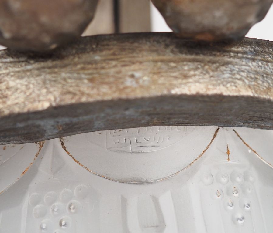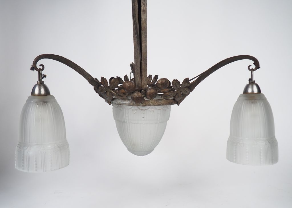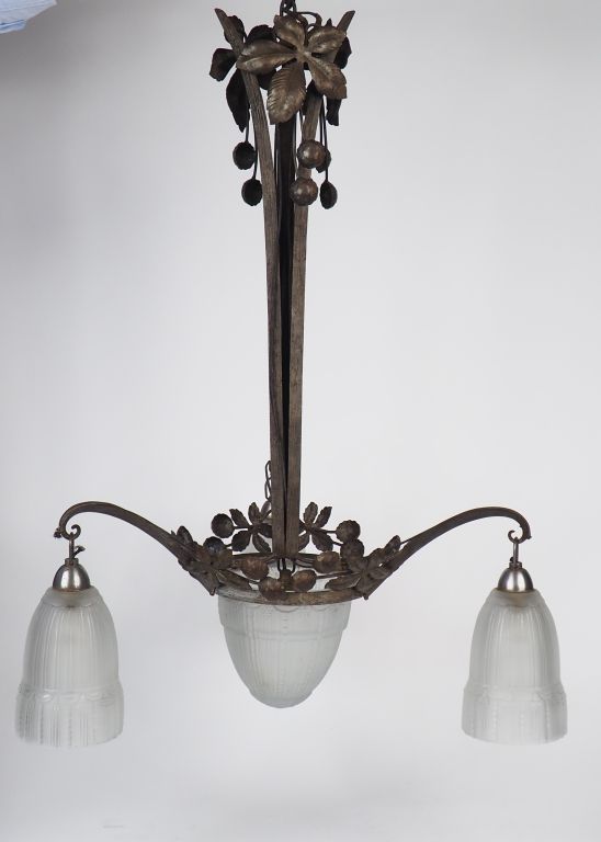 MULLER frères à Luneville. Suspension Art Déco en fer forgé et verre à décor de chataignes et de motifs géométriques, éclairant à 4 lumières. Signée. Dim. 74 x 47 cm.