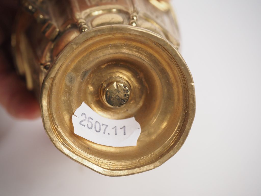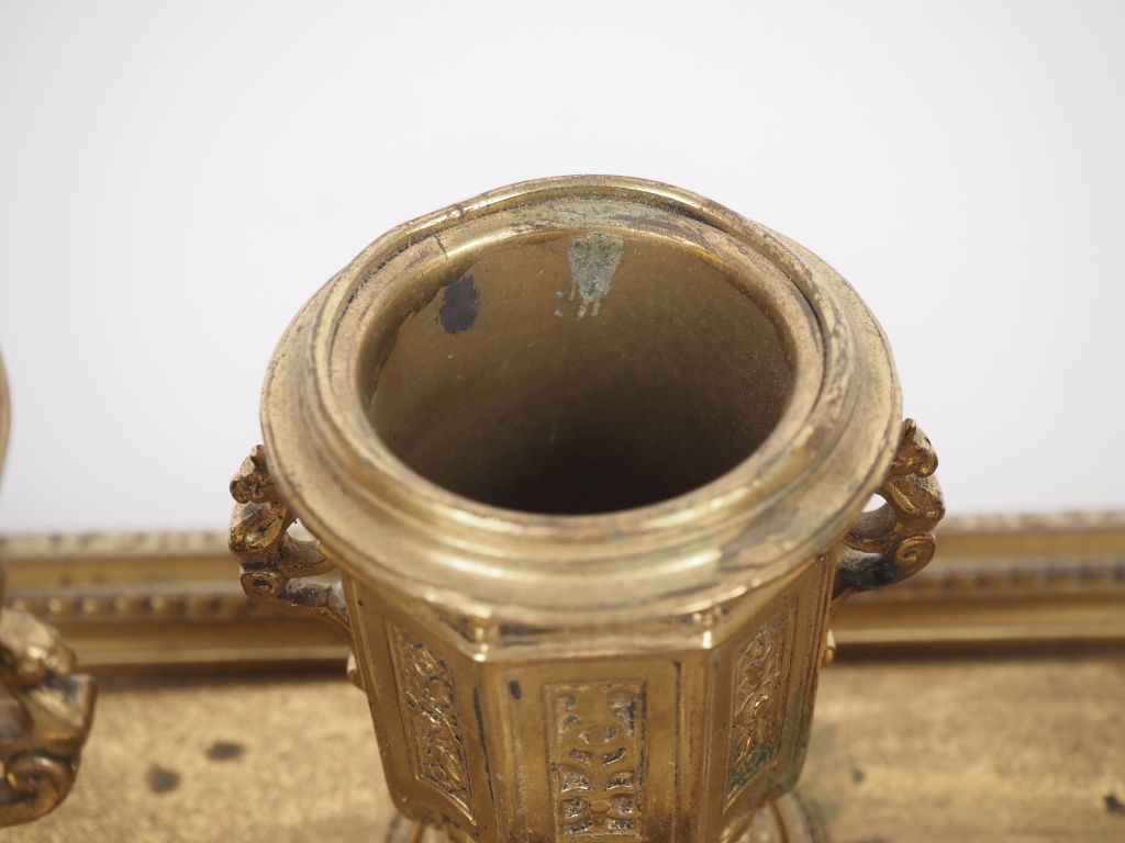 Nécessaire de bureau de style Louis XIV en bronze doré à décor de frises de perles et de rinceaux feuillagés, 4 pièces et un plateau. Monogrammé H.P (enfoncements)