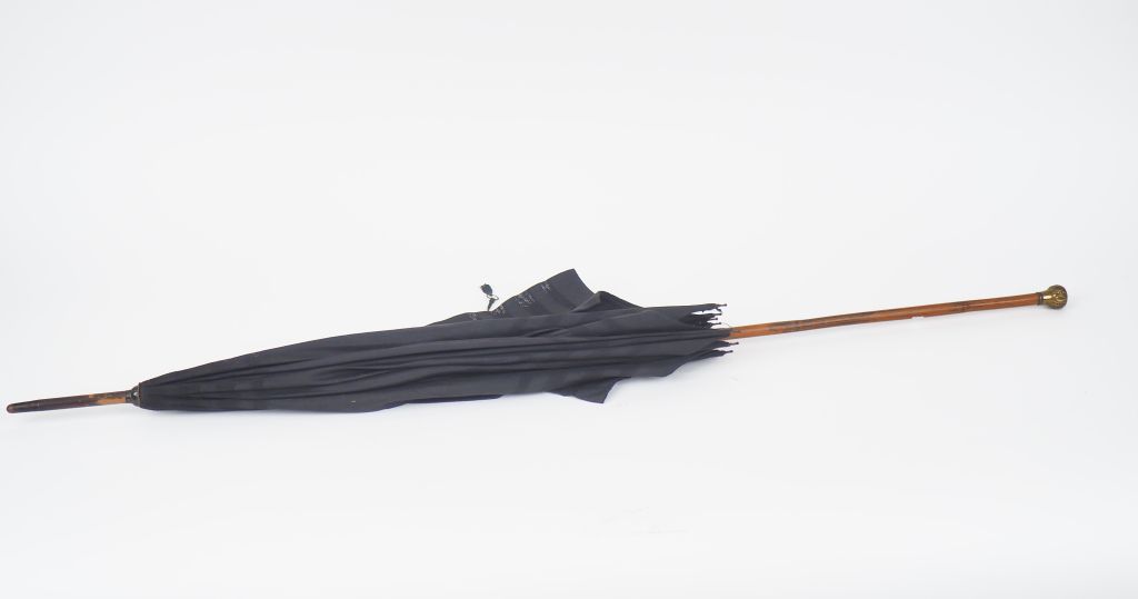 Ombrelle cévenole en tissu noir, bois et métal doré. L. 100,5 cm.