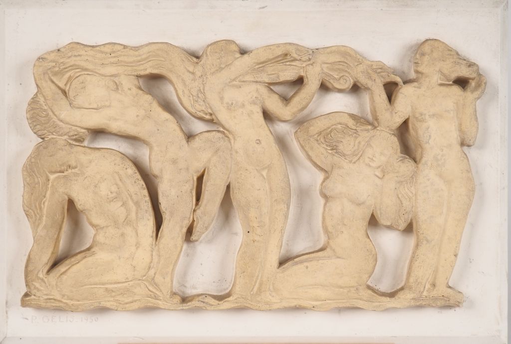 P. GELIS. "Allégorie de la danse". Plaque en stuc signée en bas à gauche et datée 1950. Dim. 40 x 58,5 cm.