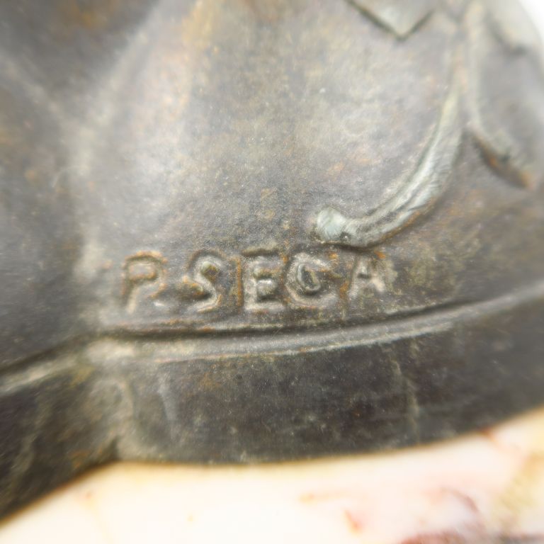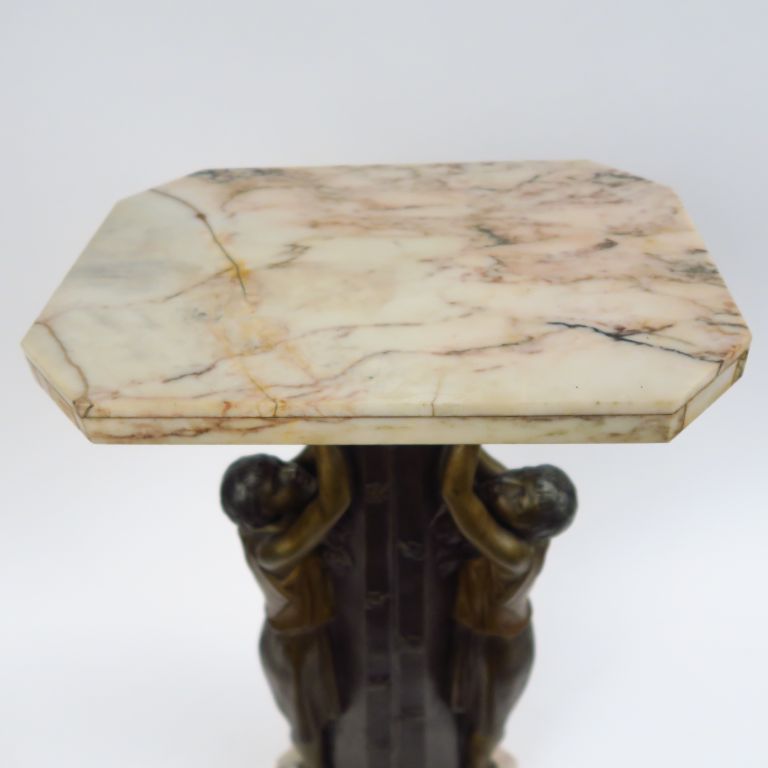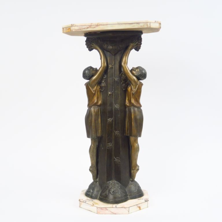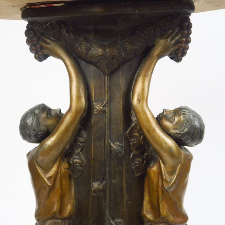 P. SEGA Sellette 1930 en régule et marbre, à décor de deux fillettes soutenant des pampres. H. 68 cm