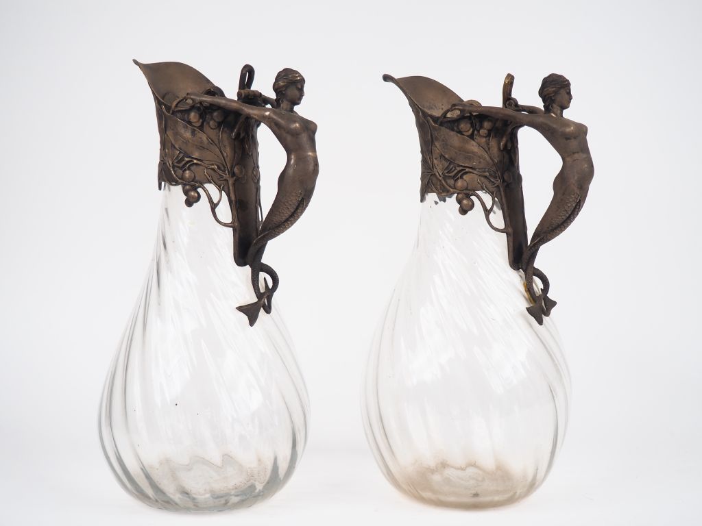 Paire d'aiguières Art Nouveau en verre et métal, les anses en forme de sirène, monture à décor de gui. H. 34 cm