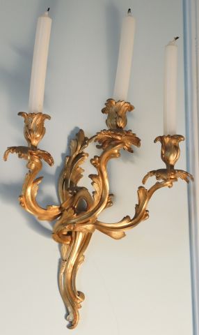 Paire d’appliques de style Louis XV en bronze doré, éclairant à trois lumières. H. 33 cm