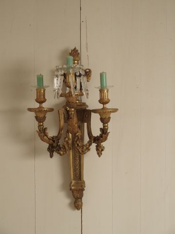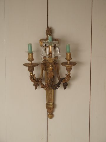 Paire d'appliques de style Louis XVI en bronze doré à décor de pot à feu, de guirlandes de fleurs et de piastres éclairant à trois lumières. H 60 cm