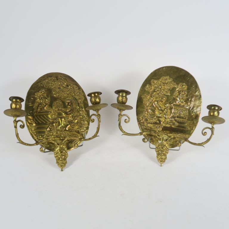 Paire d'appliques doubles à réflecteur de style Louis XVI en bronze à décor de marchande d'amours et de mascarons. Dim. 31 x 32 cm