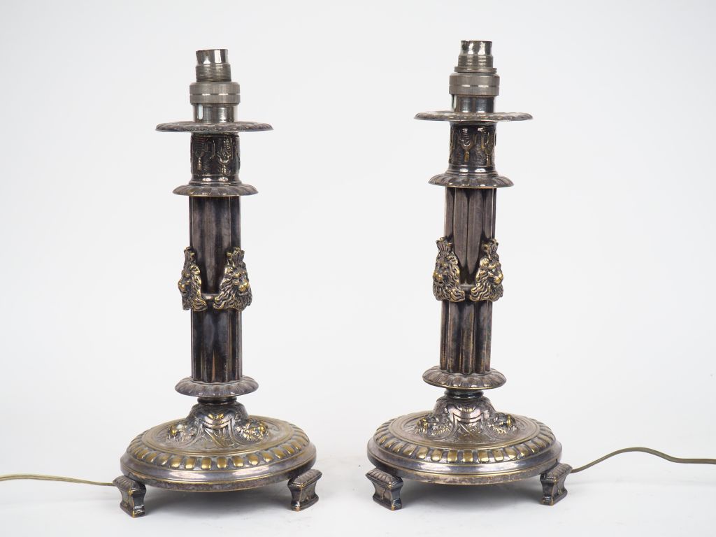 Paire de bougeoirs de style Haute-Epoque en métal argenté à décor de lions couronnnés, montés en lampe. H. 30 cm