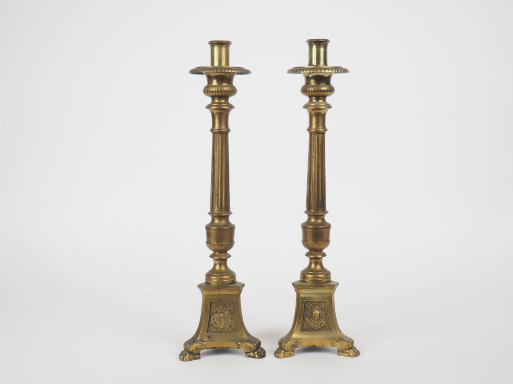 Paire de bougeoirs de style Louis XIV en laiton, à décor de tête d'ange et de Sacré Cœur, pieds griffes H. 43 cm