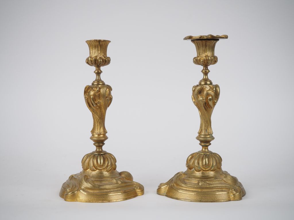 Paire de bougeoirs Napoléon III de style Louis XV en bronze doré à décor de rinceaux feuillagés. H. 23,5 cm. (Manque une bobèche).