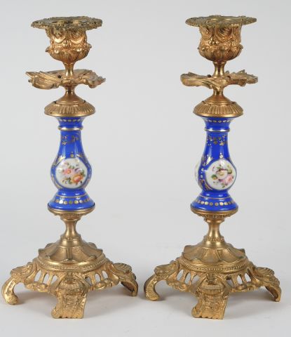 Paire de bougeoirs Napoléon III en bronze doré, fût en porcelaine à décor de fleurs polychromes dans des réserves sur fond bleu