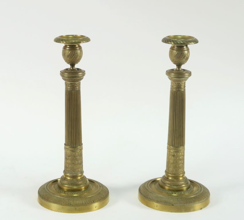 Paire de bougeoirs XIXème de style Empire en bronze, à décor de fleurs, de feuillages et de rais de cœur. H. 32,5 cm