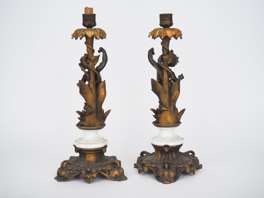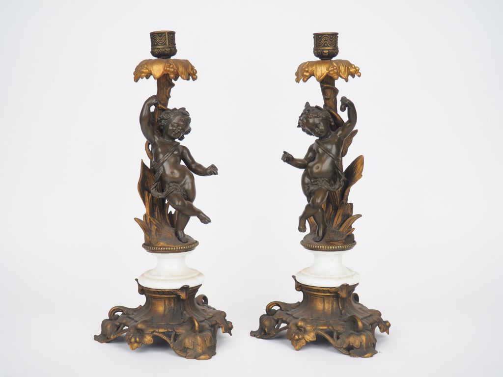 Paire de bougeoirs XIXème de style rocaille en métal patiné, doré et porcelaine blanche, en forme d'amours musiciens. H. 39 cm.