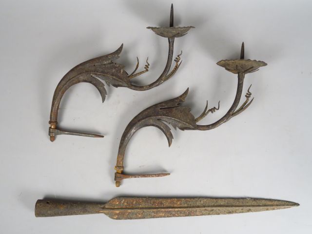 Paire de bras de lumière XVIIème en fer et tôle Pointe de lance en fer XVIIème.