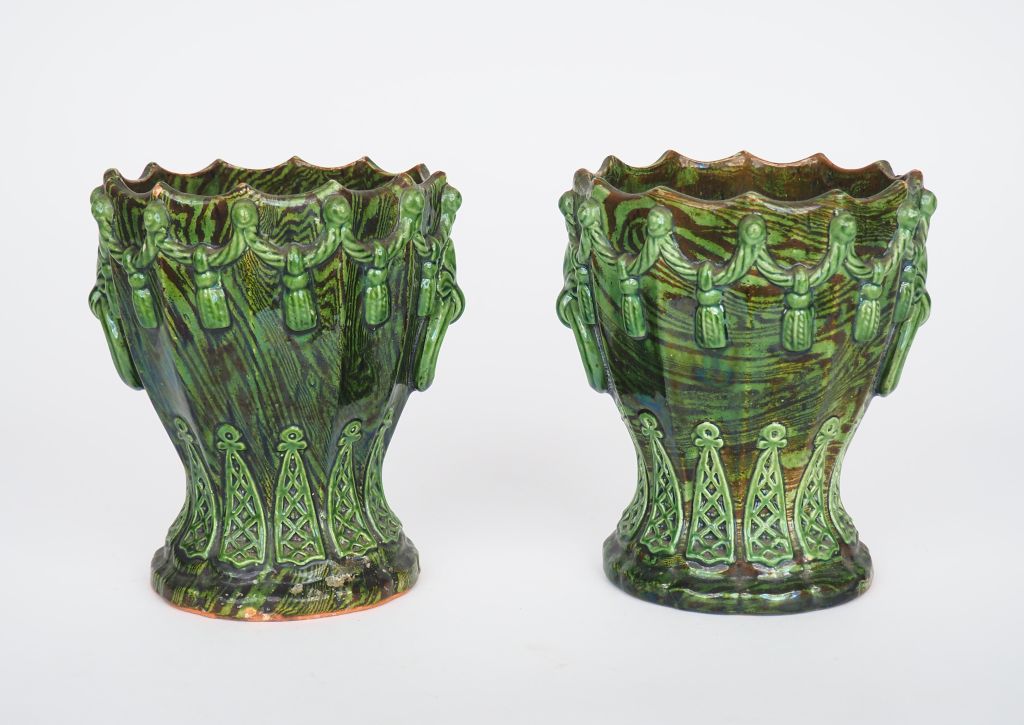Paire de cache-pots en terre vernissée verte. Dim. 15,5 x 13 cm.