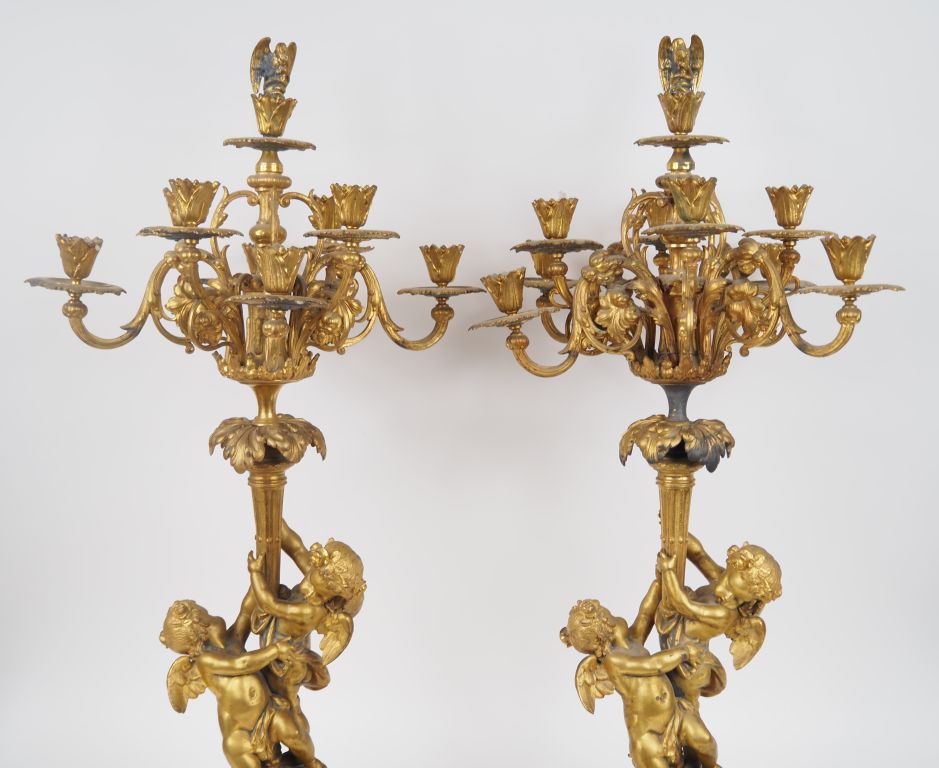 Paire de candélabres Napoléon III de style Louis XVI en régule doré à décor en relief d'angelots porte-torchères, de feuille de vigne et d'échassiers. Pieds griffes, éclairant à neuf lumières. H. 90 cm. (Oxydations, une branche détachée)