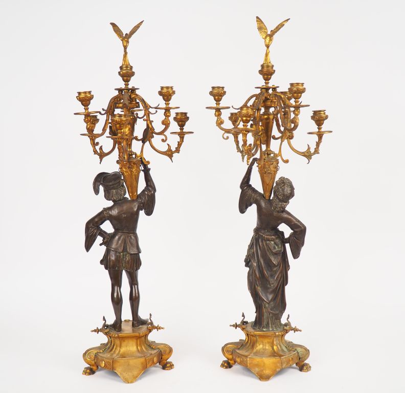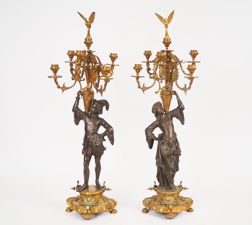 Paire de candélabres Restauration de style troubadour en bronze à patine brune et dorée, figurant des personnages du moyen âge. Eclairant à 7 lumières. H. 81 cm