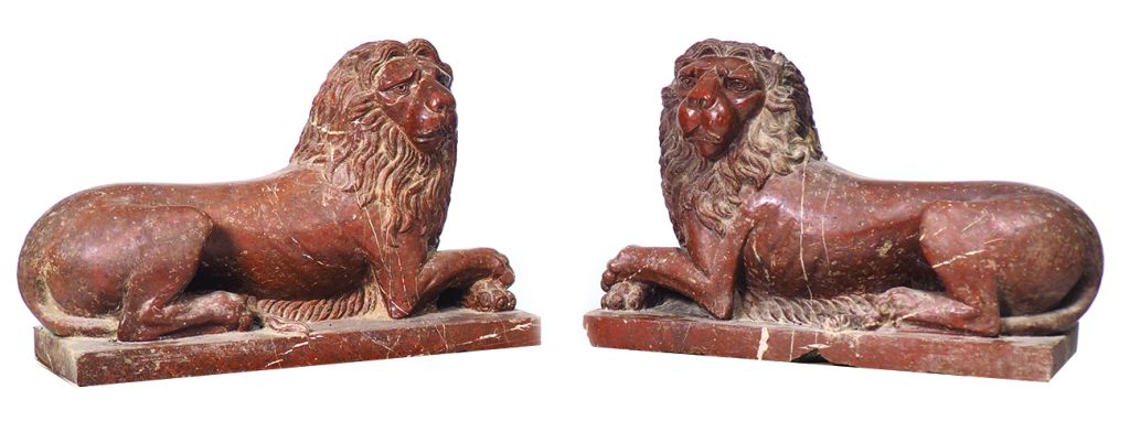 Paire de grandes sculptures XIXème en marbre rouge "Lions couchés". Dim. 49 x 72 x 30 cm.