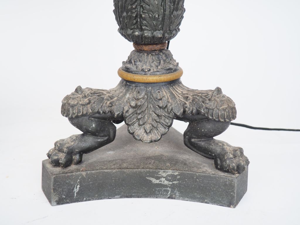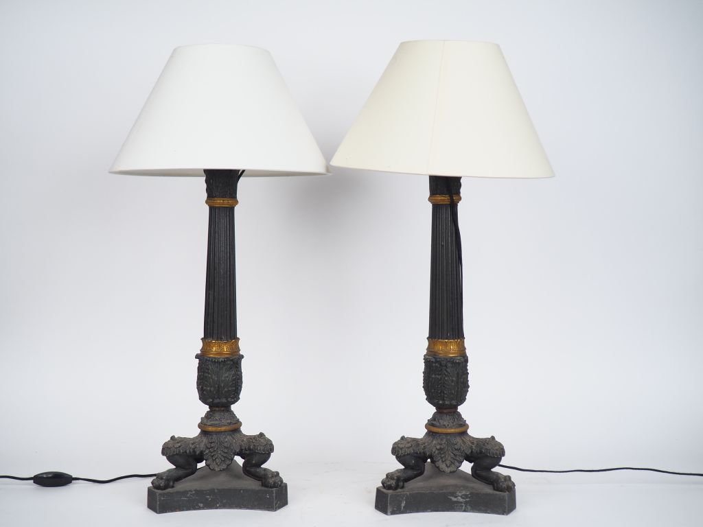 Paire de grands bougeoirs Restauration en tôle et bronze, double patine brune et dorée, pieds griffe, montés à l'électricité (non percés). H. 47,5 cm.