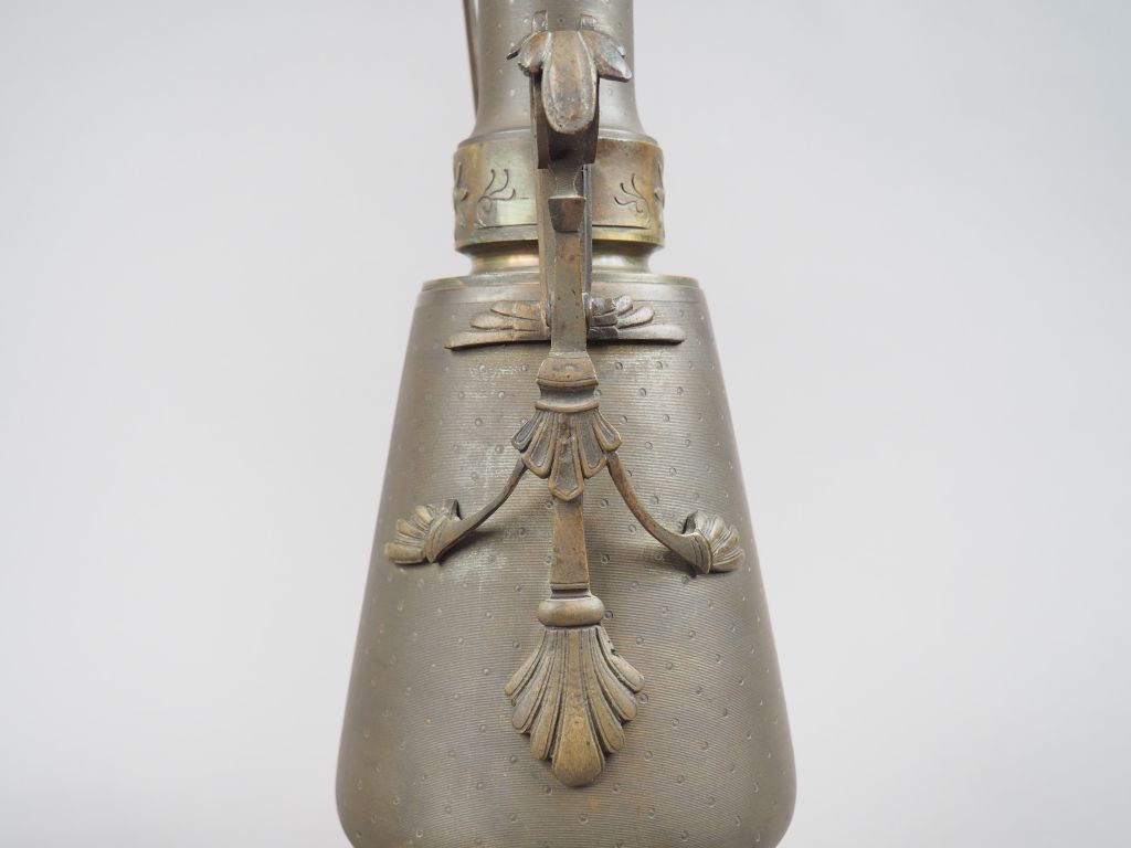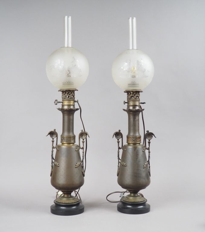 Paire de lampes à pétrole Napoléon III en bronze. Anses feuillagées. Avec leur globe. H. sans les globes : 54 cm (montées à l'électricité)