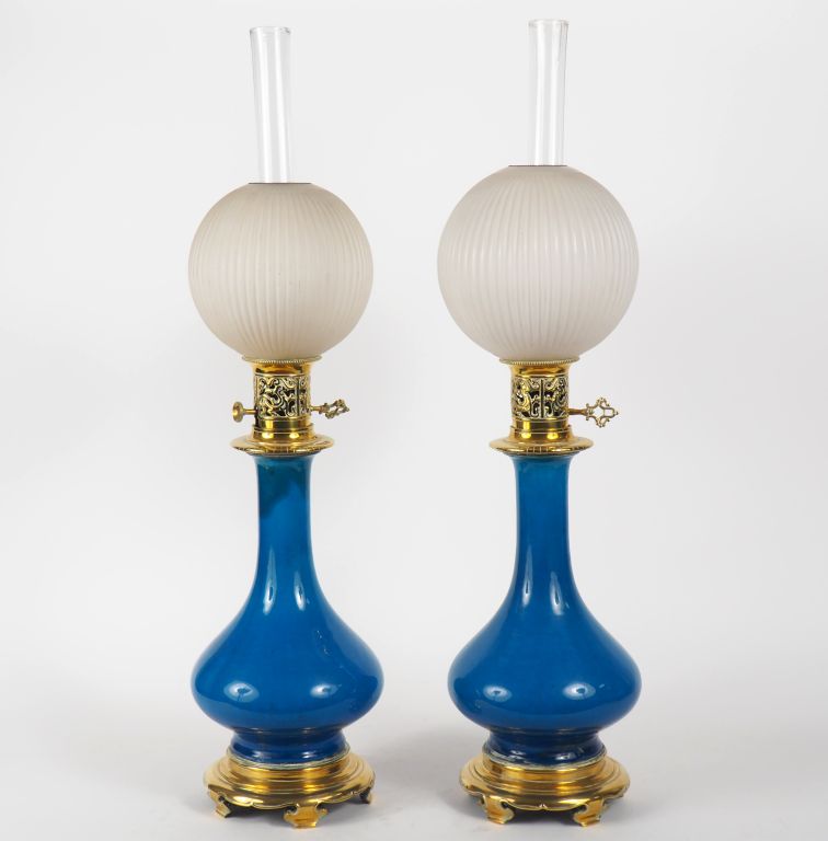 Paire de lampes Napoléon III en céramique bleu persan, belle monture en bronze de style Extrême Orient, avec ses globes à côtes, en bon état. H. avec les globes. 63,5 cm