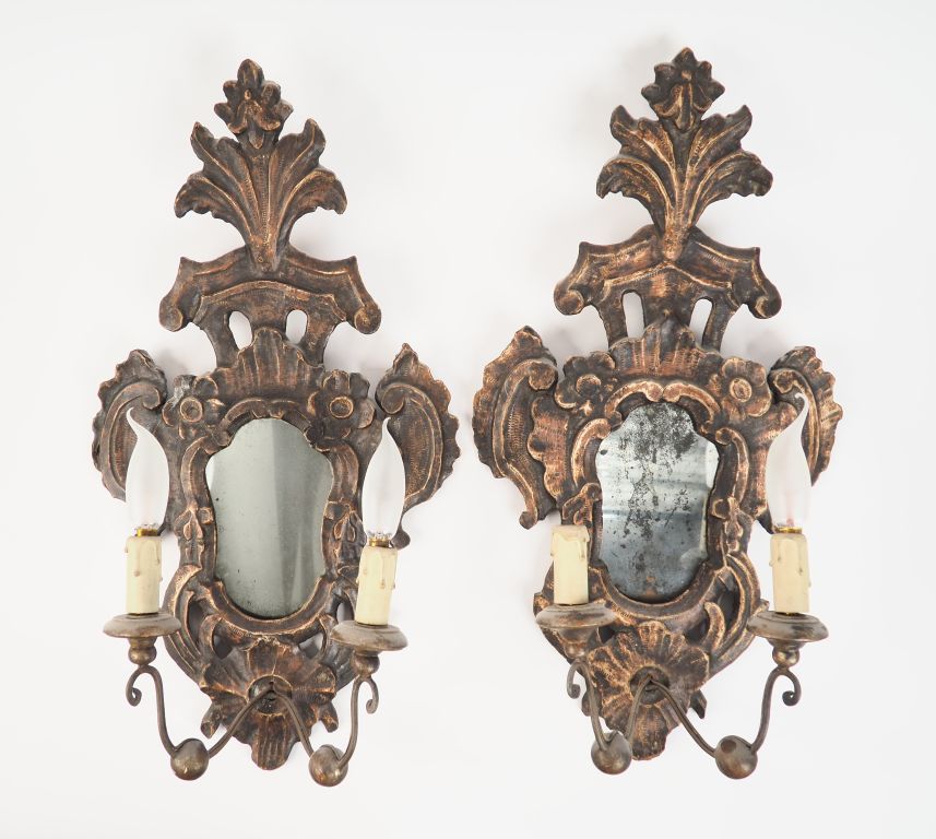 Paire de miroirs de style italien en bois sculpté et patiné, éclairant à deux lumières. H. 61 cm