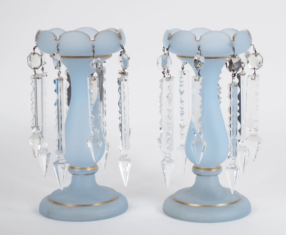 Paire de porte ananas Napoléon III en opaline bleue et dorée et pampilles en cristal. H. 24,5 cm (micro égrenures sur les pampilles)