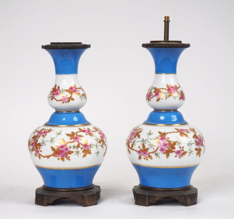 Paire de vases balustre Napoléon III en porcelaine polychrome à décor de branchages fleuris, montés en lampe. H. 30 cm.