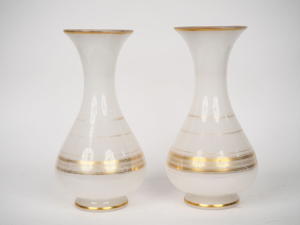 Paire de vases ovoïdes Napoléon III en opaline blanche et dorée. H. 34,5 cm