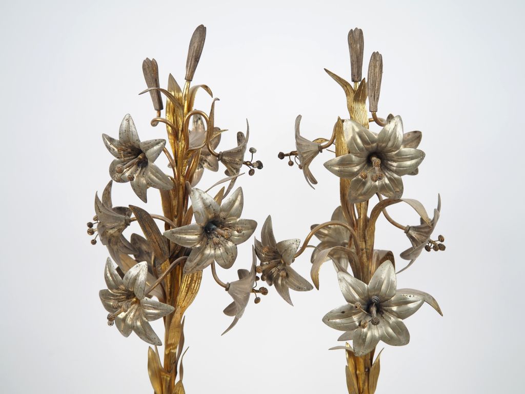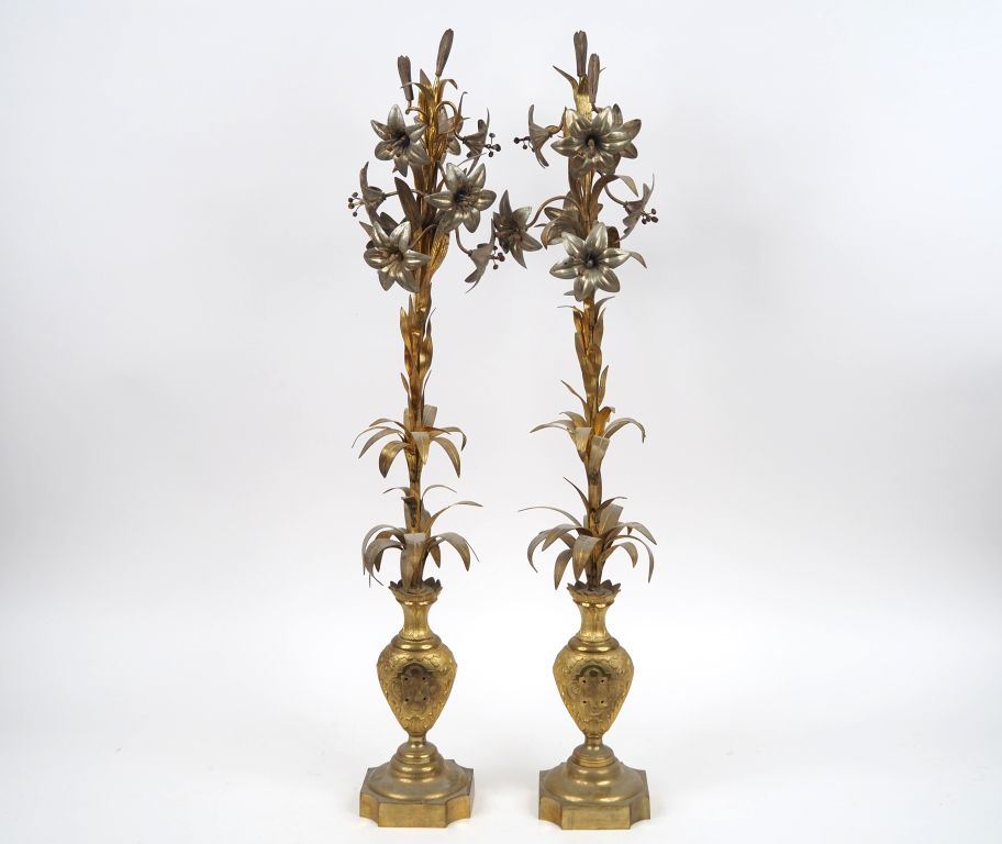 Paire d'éléments décoratifs Napoléon III en bronze et laiton à décor en relief de lys en fleur dans des vases Medicis. H. 83 cm.