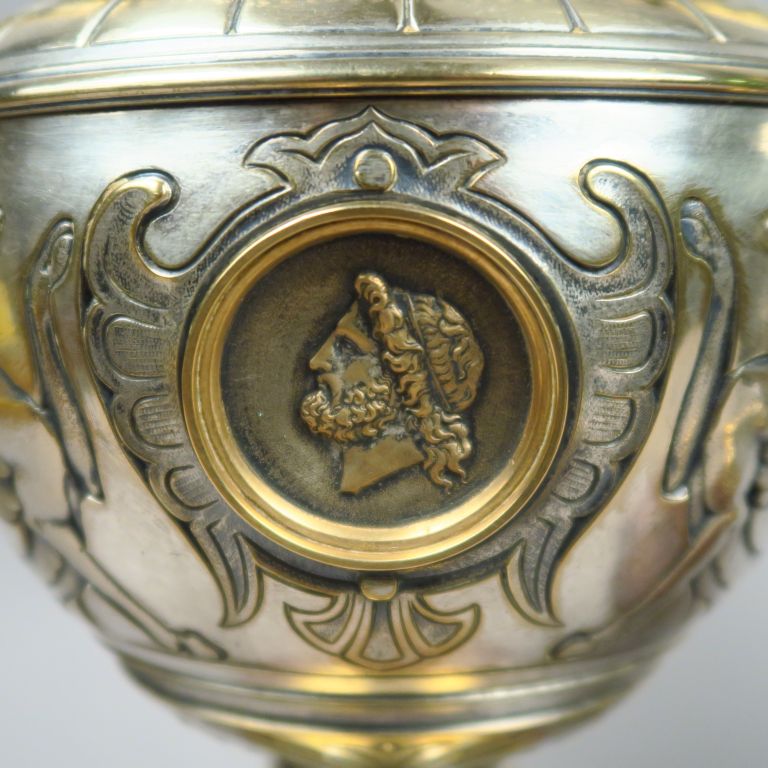 Paire d'urnes XIXe en bronze en partie argentée et marbre rouge à décor de chimères, de rinceaux et de profils d'hommes à l'antique. H. : 47 cm.