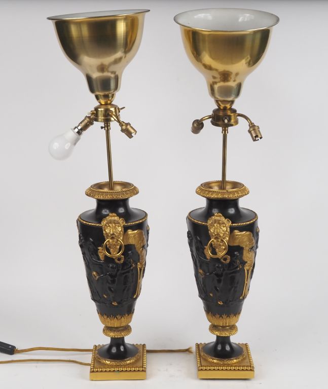 Paire d'urnes XIXème en bronze patiné, ciselé et doré, à décor en léger relief de bachanales et d'athéniennes, anses en forme de mufle de lion, montées en lampe. H. 45,5 cm