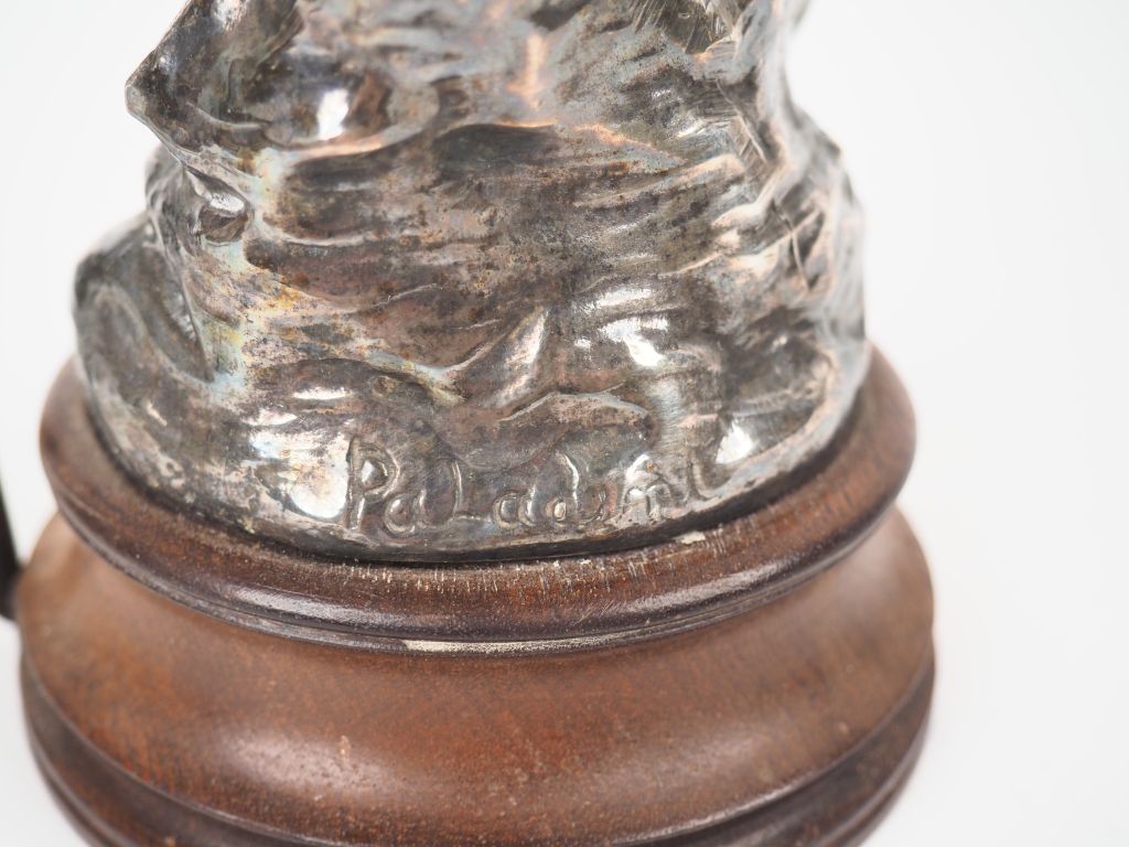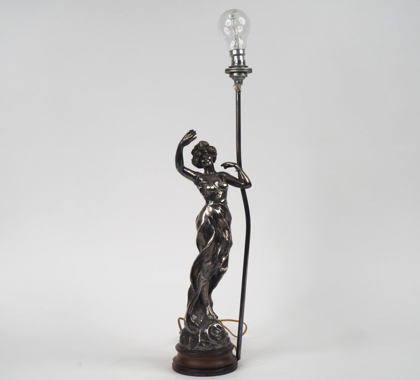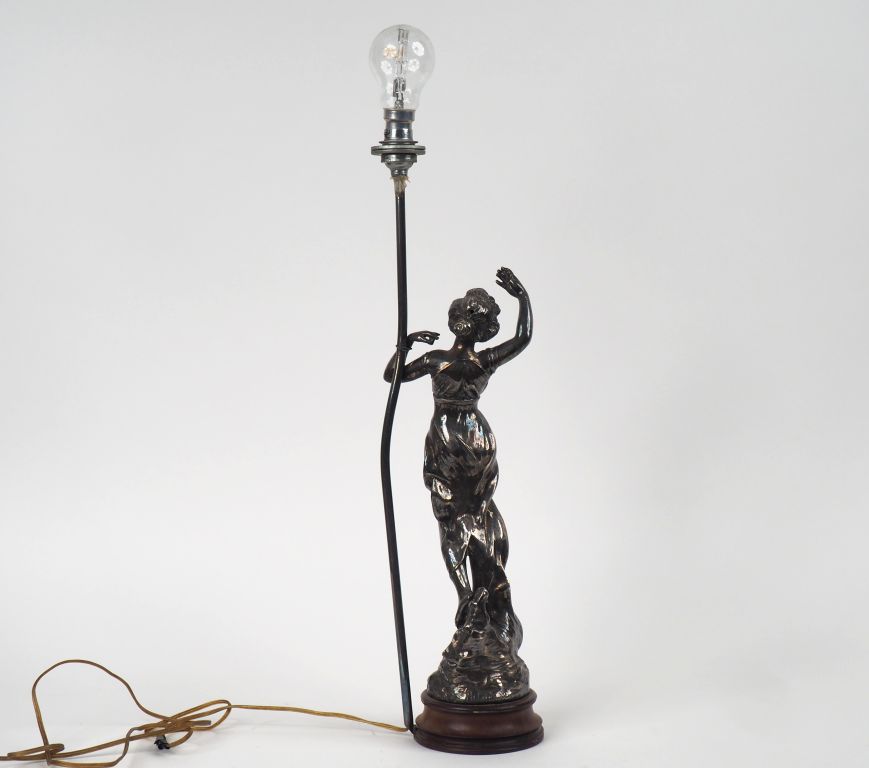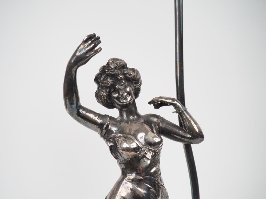 PALADINI. Sujet 1900 en argent ou métal argenté représentant une jeune femme, monté en lampe. H. du sujet : 36 cm
