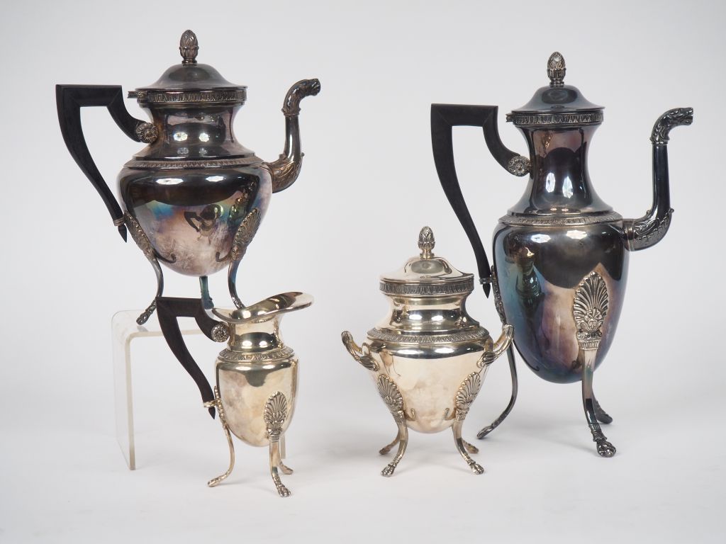 Partie de service à café et à thé quatre pièces en métal argenté de style Empire. Comprenant: - 1 théière - 1 cafetière - 1 pot à lait - 1 sucrier