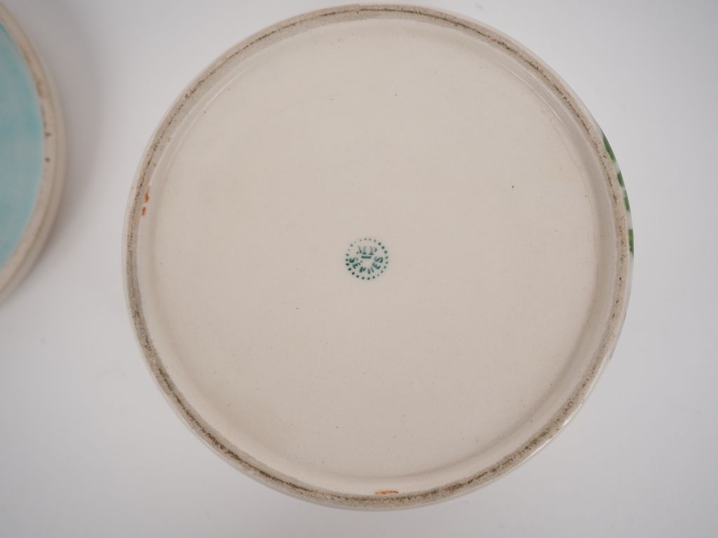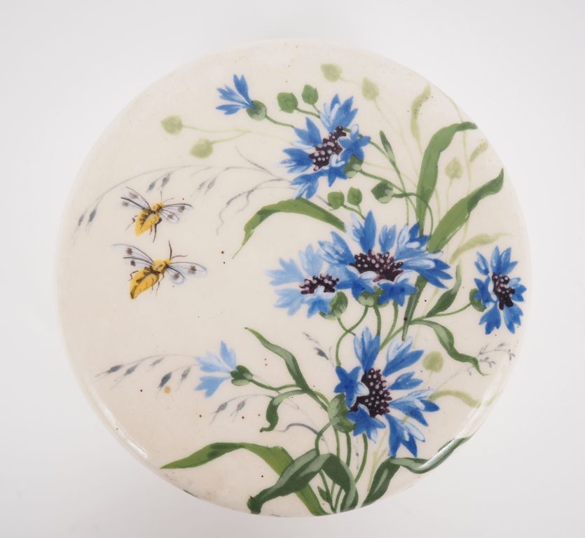 Paul MILET. Bonbonnière Art Déco en céramique à décor polychrome de barbeaux et d'abeilles. H. 6 cm Diam. 11,6 cm
