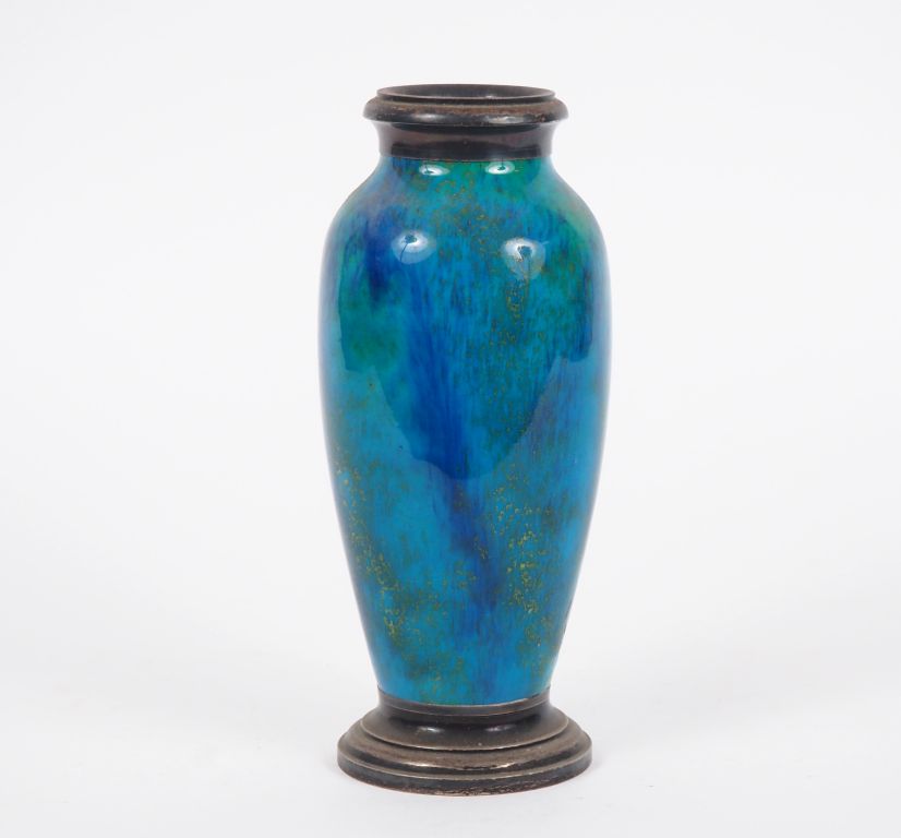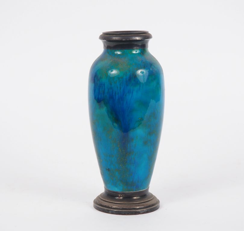 Paul MILLET à Sèvres. Vase en céramique turquoise pailletée d'or, monture en argent 925, poinçon Minerve Signé H. 20 cm