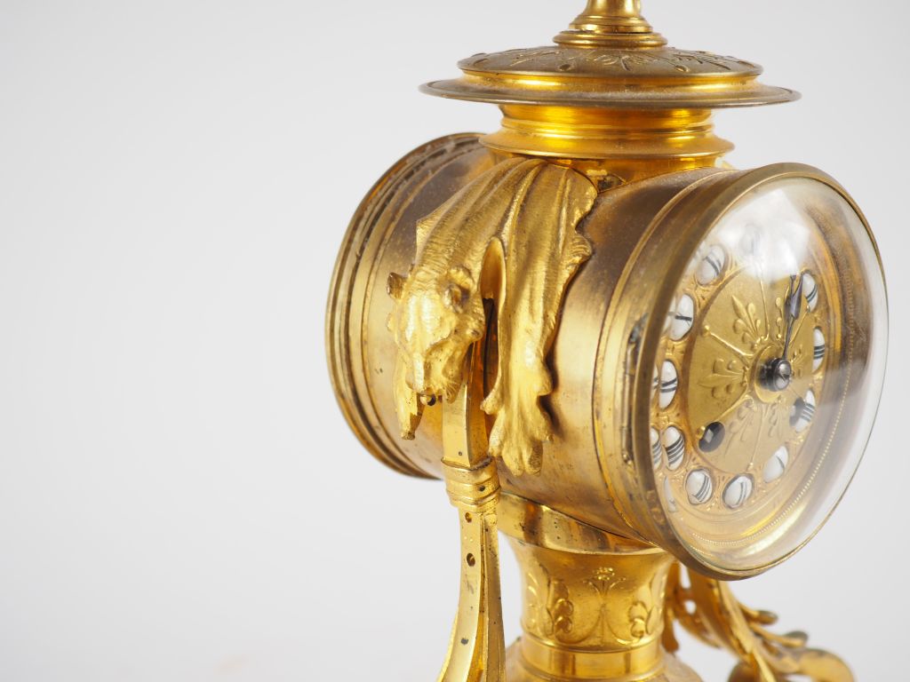Pendule de cheminée Napoléon III en métal doré et bronze à décor de femme à l'antique en buste et de scène mythologique dans une réserve. Chiffres du cadran émaillés. H. 43,5 cm.