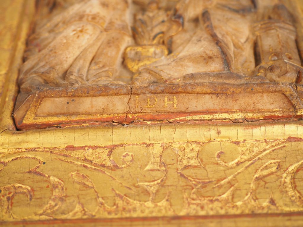 Plaque en albâtre sculpté fin XVIème - début XVIIème. "Annonciation" Restes de dorure et polychormie. Dans un cadre XVIIème en bois doré. Monogrammé sous la terrasse IDH. Dim. de la plaque: 12 x 9,5 cm Dim. du cadre: 22,5 x 20 cm