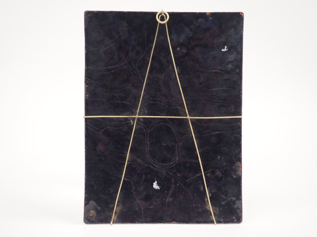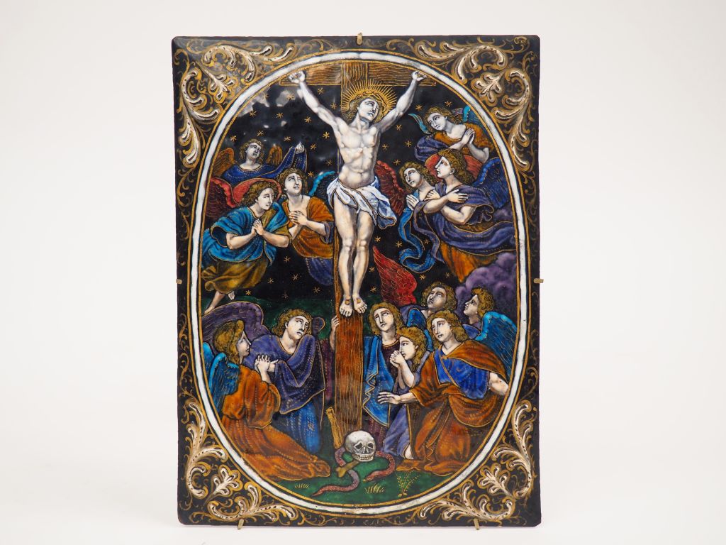 Plaque en émail peint polychrome avec rehauts d’or représentant la Crucifixion dans un médaillon ovale cantonné de rinceaux, contre-email noir. XIXème siècle dans le style des émaux de Limoges Hauteur : 21,5 cm – Largeur : 16 cm Expert : Laurence Fligny