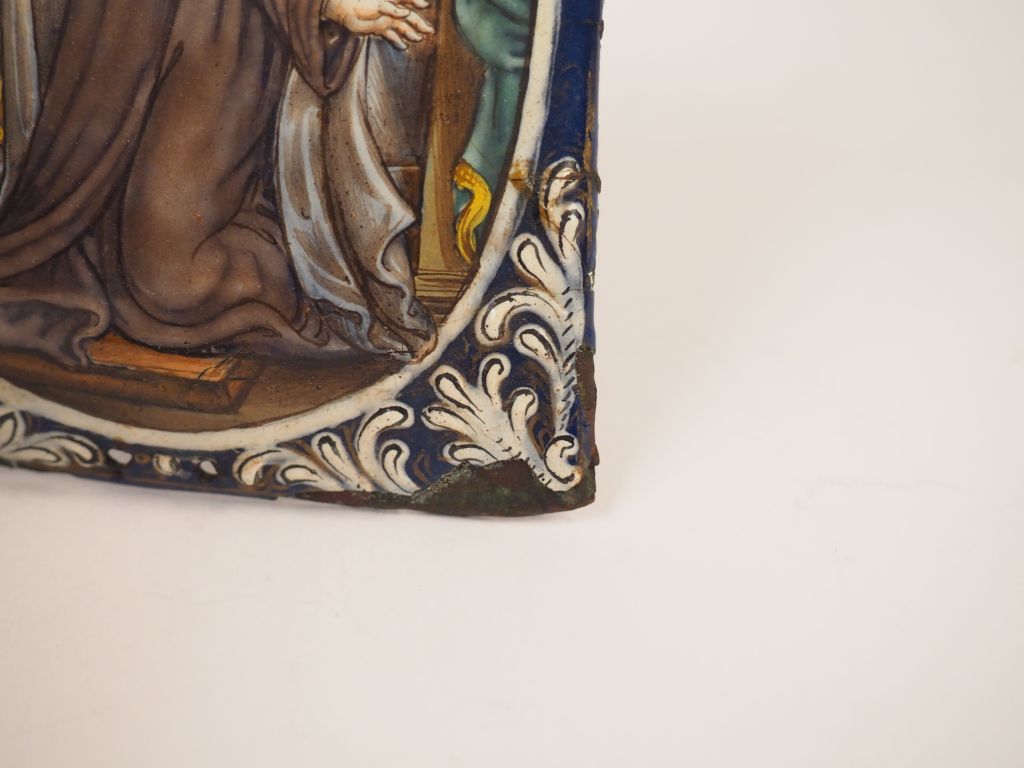 Plaque en émail peint polychrome représentant l’Extase de sainte Thérèse d’Avila. Limoges, atelier des Nouailher, fin du XVIIème - premier tiers du XVIIIème siècle. Hauteur : 11 cm – Largeur : 8.5 cm (quelques manques) Expert : Laurence Fligny